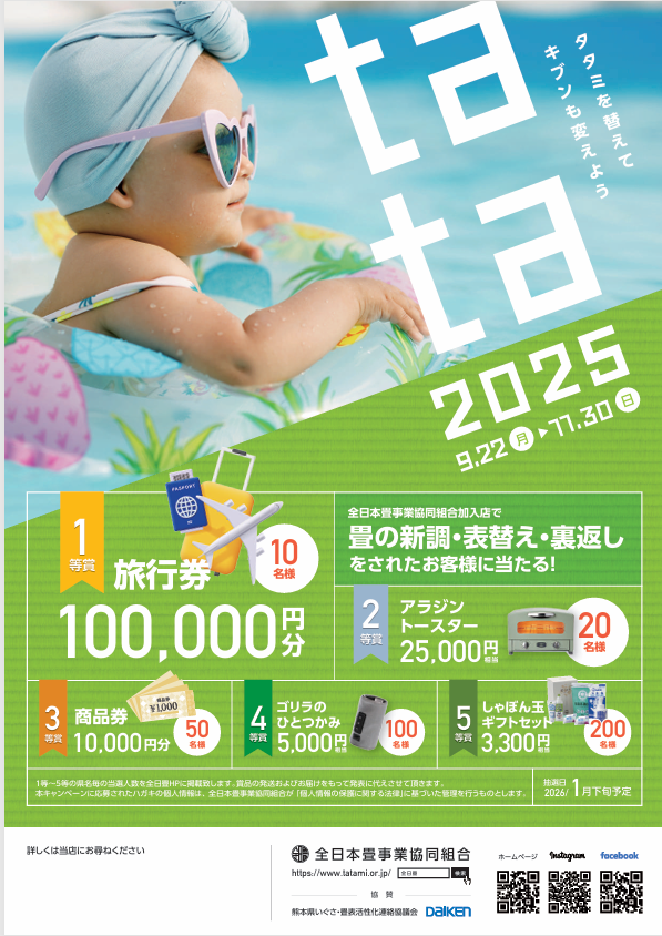畳を替えて10万円旅行券が当たる!!ta-ta2025キャンペーン中 投稿日/ 2025年10月4日 お知らせ 今年も始まりましたta-taキャンペーン !!全日本畳事業協同組合加盟店では、今年も畳を替えて10万円旅行券が当たるta-ta抽選応募が始まりました。山梨県内組合加盟店46店舗で一斉に9月22日から11月30日に畳替えを行ったお客様に、応募はがきが配られます。昨年の実績は1等10万円含め沢山のお客様の当選がありました。秋の畳替えをご検討の方は、ホームページからお近くの技能士のお店を探し、畳替えをぜひご検討ください。